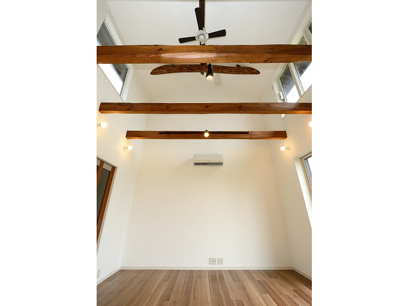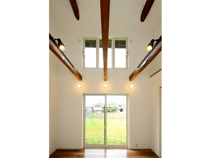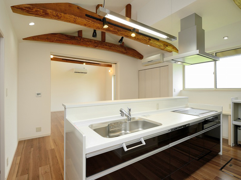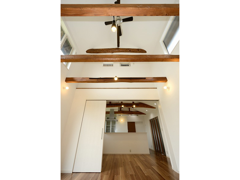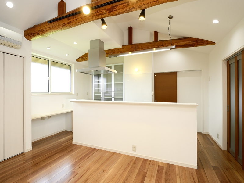 光を取り入れるために、使用していなかった2F部分まで吹き抜けにして高所から採光と、白い壁の光の反射で光の問題をクリアしました。そのことで現れた、この家を今まで支えてきた美しい梁を、生活空間の中に引き込みました。